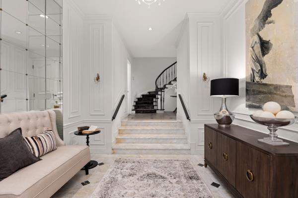 这栋巴黎风格的房屋的法式双开门通往一处门厅,门厅的天花板高10英尺(约合6米),地面铺着大理石,两侧各有一间卧室。弯曲的大楼梯通往主层,里面有翻新过的厨房、餐厅和舞厅大小的客厅,客厅里有一座燃木壁炉,麦克林托克曾在这里举办过活动。据房地产经纪人辛西娅·霍瓦尔(Cynthia Howar)说,厨房和餐厅的玻璃门通往后院,后院有一棵200多年的榆树。外部还包括一个石板露台。