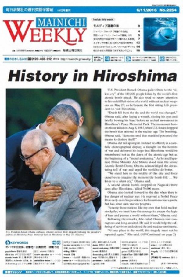 2016年6月11日,《每日新闻周刊》报道了巴拉克·奥巴马于2016年5月27日访问广岛,这使他成为第一位访问世界上第一次原子弹袭击遗址的在任美国总统。他会见了原子弹幸存者(hibakusha),提高了人们对废除核武器取得进展的希望。