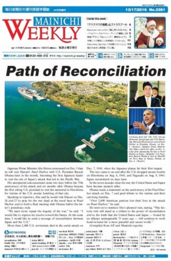 据《每日新闻》2016年12月17日报道,2016年12月5日,时任日本首相安倍晋三宣布将访问夏威夷珍珠港。他成为首位访问导致太平洋战争的日军袭击地点的在任日本领导人。