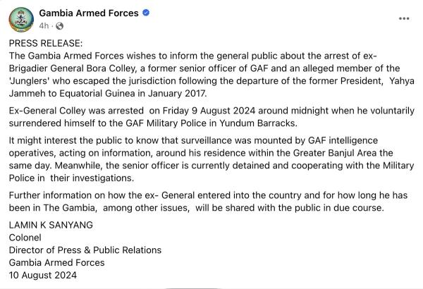 冈比亚武装部队在脸书上宣布逮捕博拉·科利的声明截图。