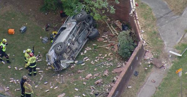 下午12点刚过,这辆车撞穿砖墙,翻到了房子的前院