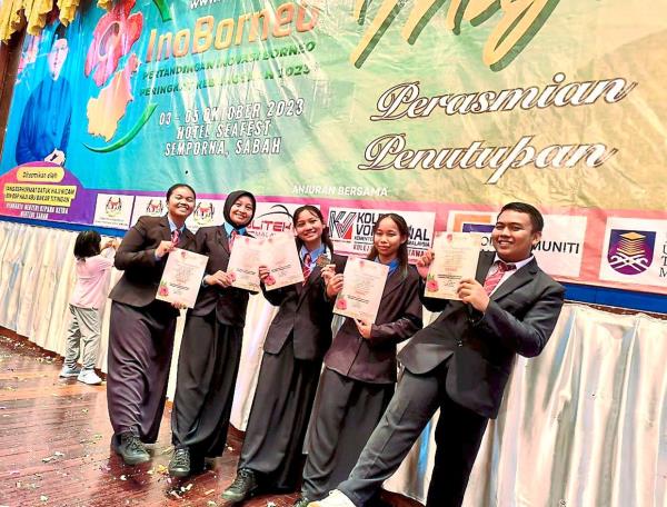 这些学生分别是Shymelysney Mooney、Susanna Qwek San San、Siti Rafbiyatul Adawiyah Josmin、Margarcesybell Safrese和Muhammad Roufieq Romena Nasir,他们在“2023年创新环境”比赛中获得了环境创新类金奖。