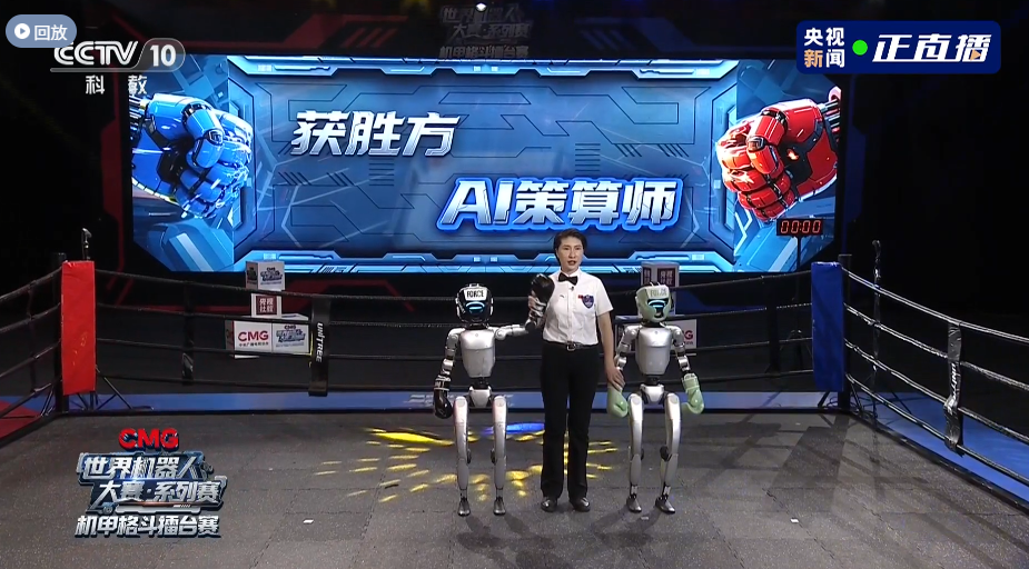宇树G1人形机器人在比赛中表现出色,由不同团队操作的机器人进行了多轮对抗。它们能够施展侧踢、膝踢、勾拳等动作,展现出出色的稳定性、平衡性和敏捷性。最终,"AI策算师"机器人夺得冠军。