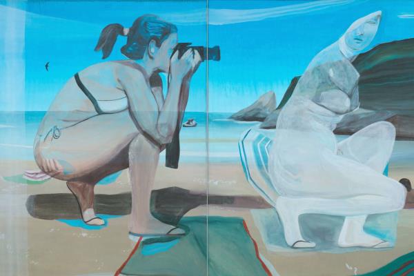 d'Art Contemporain de Marseille,他的油画可以从一个不同的角度看到,悬挂得更低,以这样一种方式,在它们的和声和破裂中找到一种节奏。这种不和谐尤其体现在他的作品中,这些作品只能被定义为深受干扰的风景。也许有天空,有地面,通常还有一些视角,但它们的空间被莫名其妙的彩色线条纵横交错,表面上纹着同样不协调的污渍,这些梦幻般的地方居住着不完整的生物。随处可见的对古代艺术的引用自然带有与现实一样的自由和不尊重。博士学位。